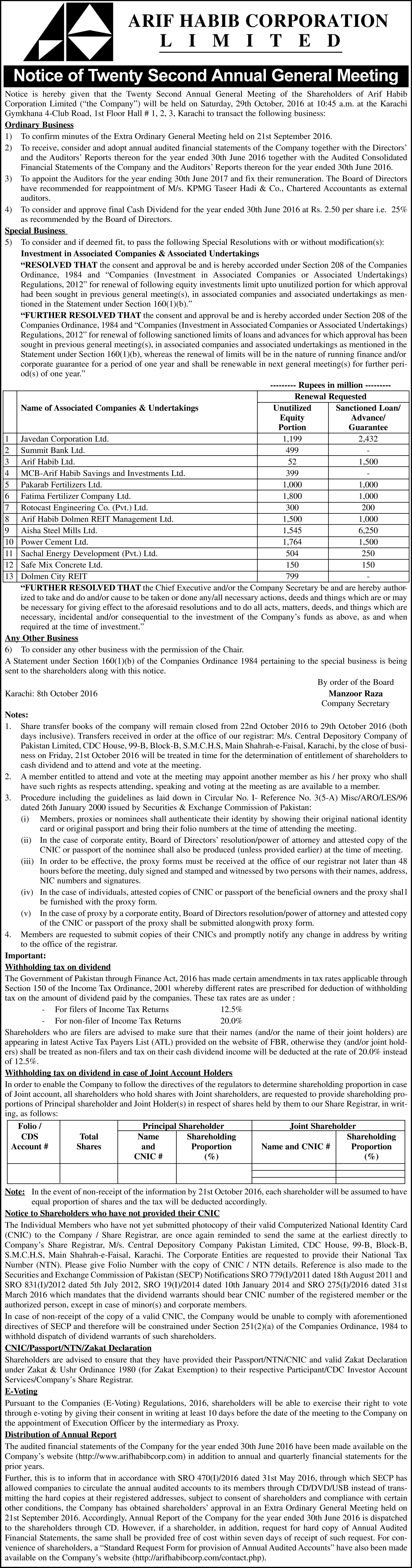 Notice of 22nd AGM of the Shareholders of Arif Habib Corporation Limited