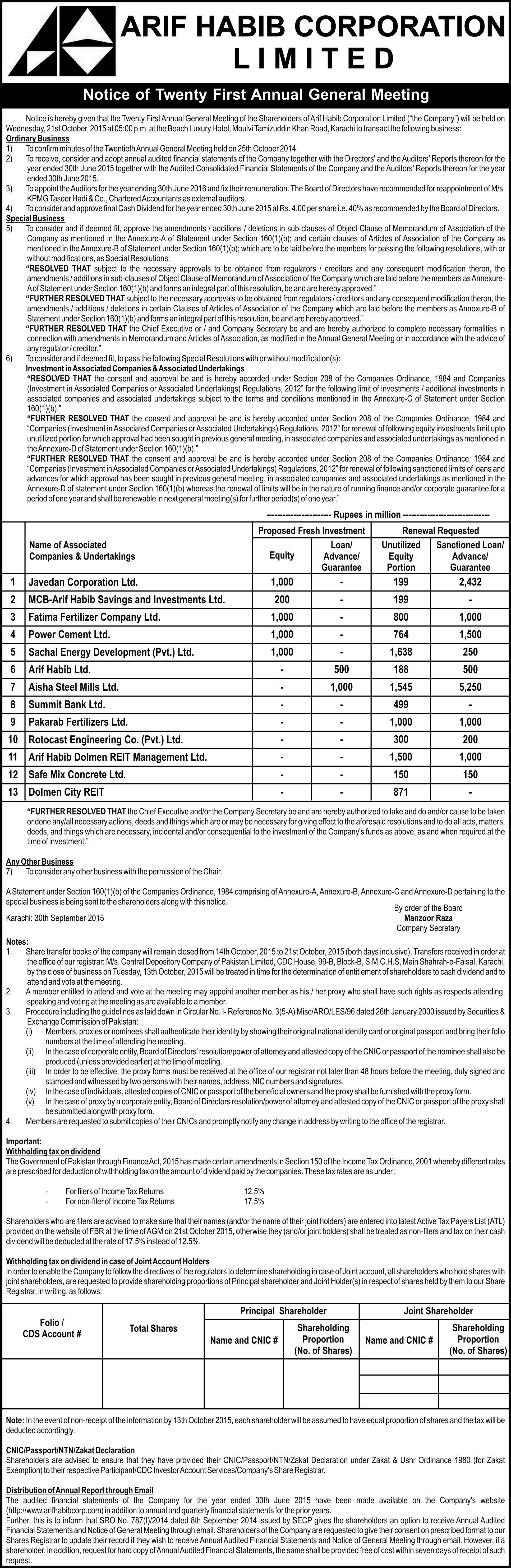 Notice of 21st AGM of the Shareholders of Arif Habib Corporation Limited - English